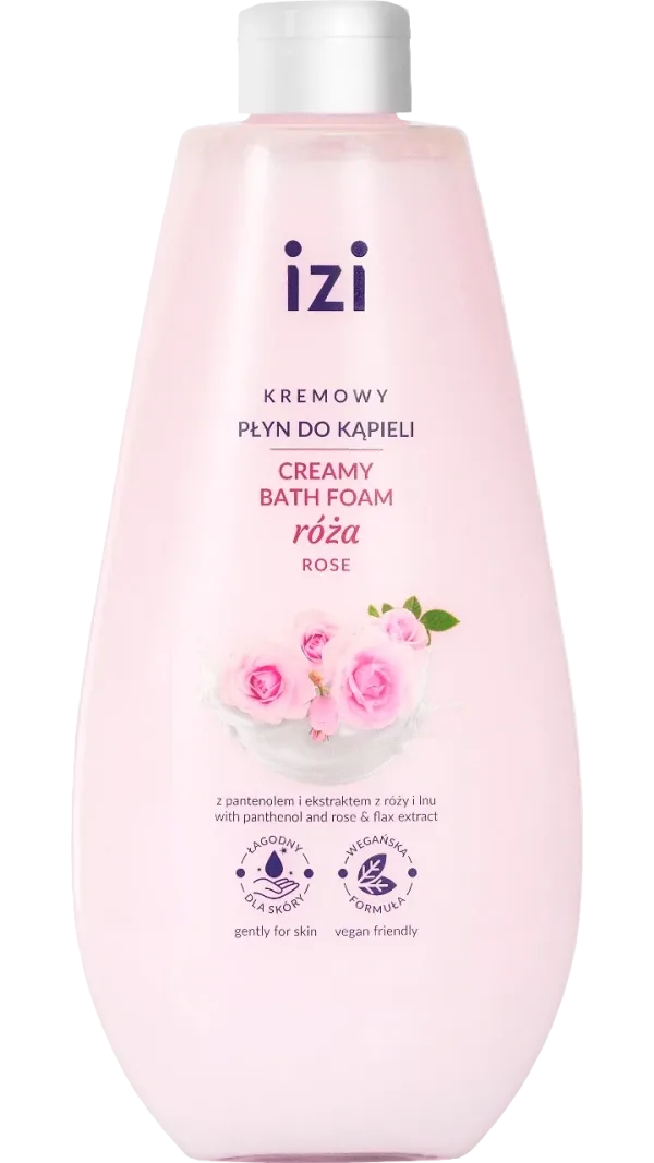 Kremowy płyn do kąpieli izi Róża z pantenolem oraz ekstraktem z róży i lnu. Zadba o Twoją skórę, a pachnąca piana wypełni po brzegi Twoją wannę. Płyn zaskoczy Cię zapachem – zapomnij o nucie klasycznej róży – nasz zapach jest lekki, świeży, pełen energii i przyjemności. Produkt został przebadany dermatologicznie, ma wegańską formułę, a jego pH jest przyjazne dla Twojej skóry. Zanurz się w kremowej pianie i wypełnij łazienkę zapachem róży.
